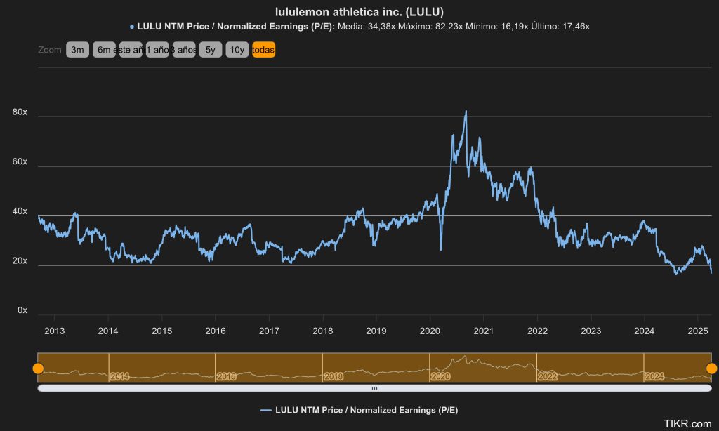 Actualmente, Lululemon cotiza a un PER estimado a 12 meses de 17 veces, mientras que su media de los últimos 5 años es de 34,38x.